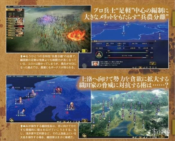 其次,作为AI的时候,各路大名会依照所持有的「志」行动,从而获得如史实般的势力性格。如织田信长由于持有「天下布武」的「志」,会利用「农兵分离」和「乐市乐座」军事经济力量成长迅速的特性不断扩张势力,继而西进上洛。