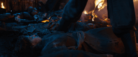 接下来,画面转到预告一开始出现的星球,洛基手持宇宙魔方穿过堆积如山的尸体,从穿着来看这些尸体似乎是阿斯加德难民,洛基一脸恐惧将魔方交给灭霸,似乎是为了确保阿斯加德人民不再受到灭霸的屠戮。