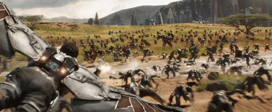 在接下来的快剪镜头中,我们看到黑寡妇拿着一把短刃刺向某人,奇异博士摆出魔法阵之后又解除,然后数艘飞船降落至瓦坎达,接着看到罗杰斯徒手搏斗,同时黑豹也在与灭霸的四手怪物搏斗。