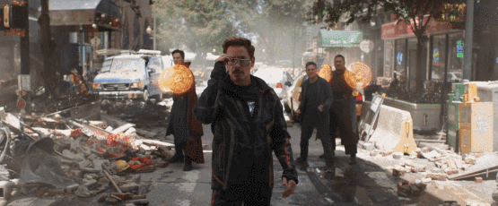 镜头转回地面,奇异博士四人来到纽约街头,摆出备战架势。有意思的是四人的表情都像见了鬼一样,斯塔克甚至摘下眼镜盯着空中的这个庞然大物。有一个细节,斯塔克胸前又出现了反应堆,而在《蜘蛛侠:返校季》中,斯塔克是没有安装反应堆的。