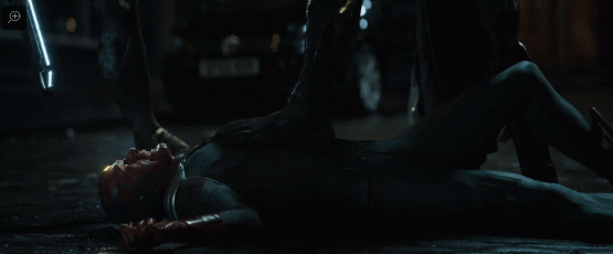 然后,镜头转到了片头的那颗星球,我们看到蜘蛛侠被灭霸按在地上摩擦,斯塔克回头眼中含泪,看来开场斯塔克握着的手就是蜘蛛侠彼得帕克的,看来小蜘蛛这次被灭霸打得不轻。