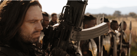 然后再回到瓦坎达,重新获得机械手臂的冬兵巴基出现在镜头中,率领军队准备作战。而在《美国队长3》中,巴基自愿冷冻,现在看来瓦坎达危急,巴基也醒来与黑豹并肩作战了。