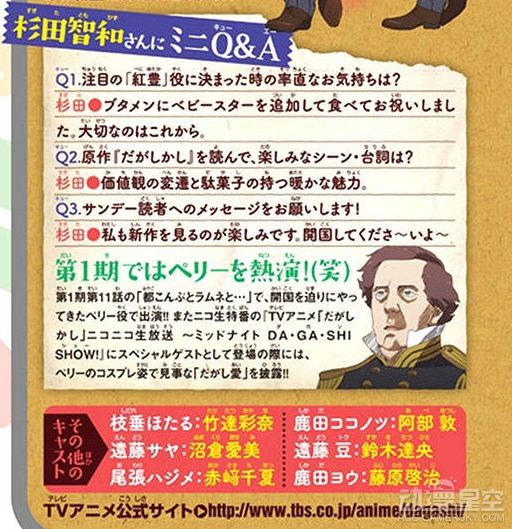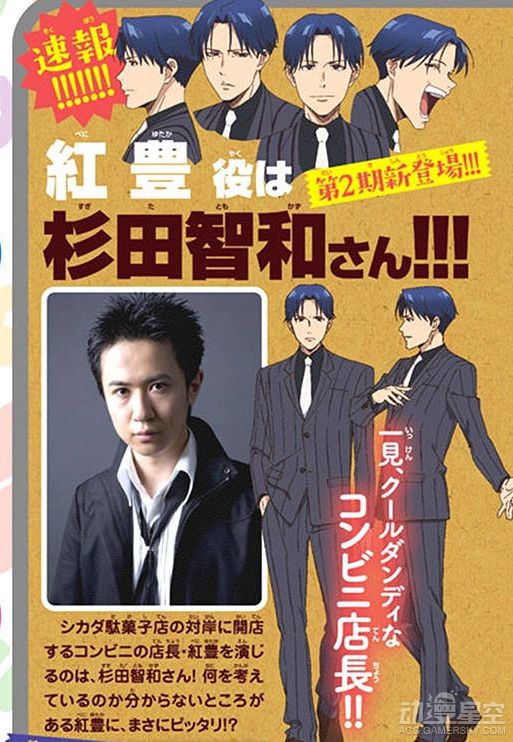 早在《粗点心战争》动画第一季里,杉田智和组长便已经有过登场,当时他担任着第11话里“黑船事件”美国海军将领佩里的配音。二期动画中,组长从龙套转正,这个极具搞笑才能的富家老哥与杉田契合度可谓非常高。