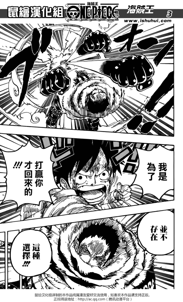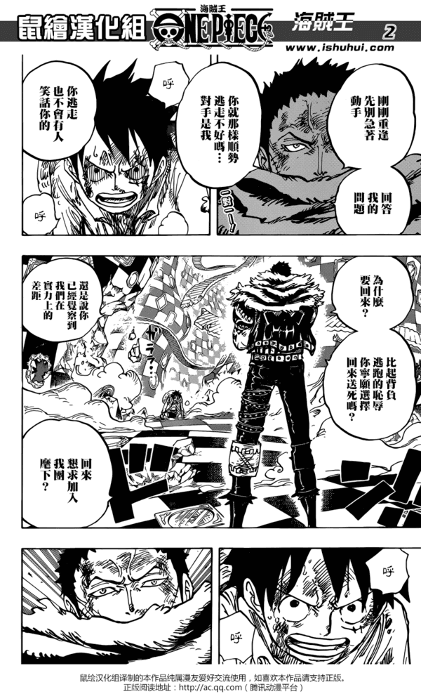 体力恢复的路飞再次来到卡塔库栗的面前,卡塔库栗让路飞回答为什么要回来,路飞告诉他自己是来打败他的,双方开战。另一边,失去理智的大妈无法控制有思想的炮弹,对桑尼号尚无法构成威胁。