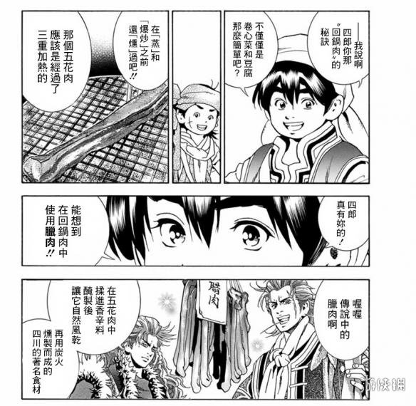 不过小当家在品尝的时候注意到了其中的猪肉是专门的腊肉,这道菜中的猪肉其实是经历了三重加热,所以口感和味道自然是不一般。不过四郎好像并没有注意到这点,这个是腊肉是那个年轻妈妈送给他的,四郎就直接将腊肉给使用了(其实是因为他没有别的猪肉了)。不管怎么样,最后大家终于能一起前行了,不知道后面还会有什么美味的菜肴诞生呢?真是好期待啊。