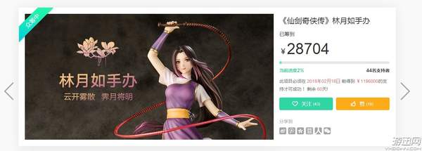 林月如1/7手办从11月20日开始众筹,2018年02月18日结束,目标金额1196000元。林月如官方手办原价668元,众筹价598元,众筹期间下单还可获得由仙剑官方画师寸身言独家绘制的特典主题海报一张,手办配有长鞭和剑两种武器,高约33cm。