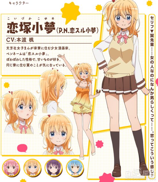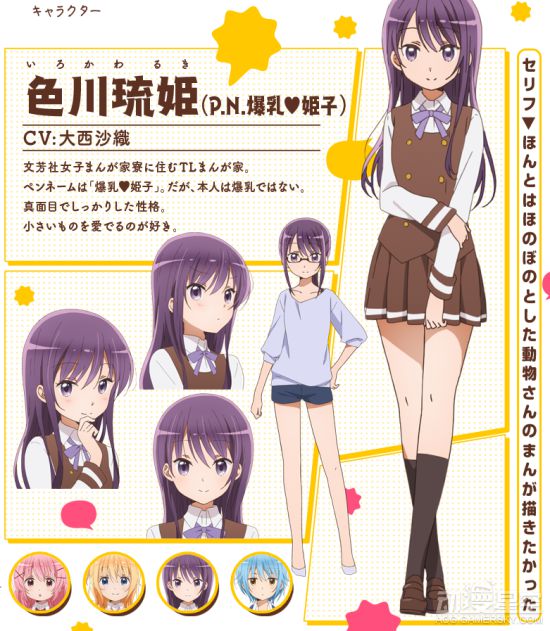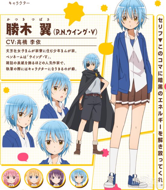 本次《Comic Girls》发布的四位主角人设图分别为萌田薰子(CV赤尾光)、恋塚小梦(CV本渡枫)、色川琉姬(CV大西沙织)和胜木翼(CV高桥李依)。由于她们所处的漫画领域和类型不同,因此每个人的气质也各有千秋。除了基本表情设定之外,官网还一并发布了少女们的制服姿态和画漫画时的居家服形象,充满可爱的气息。
