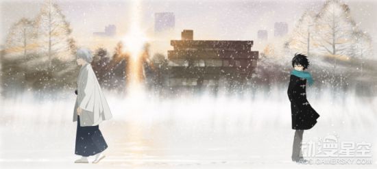 SHAFT改编的电视动画《3月的狮子》第二季下半章宣传绘公布,大雪纷飞的傍晚,宗谷冬司和桐山零两人背对而立,桐山零回头眺望宗谷冬司。