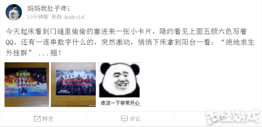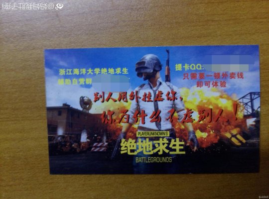 本来以为这已经算是很嚣张的卖挂了。没想到还有更先进的,刚刚有网友爆料:今天起床看到门缝里偷偷的塞进来一张小卡片,隐约看见上面五颜六色写着QQ、还有一连串数字什么的,突然激动,悄悄下床拿到阳台一看:“绝地求生外挂群” ...翘!
