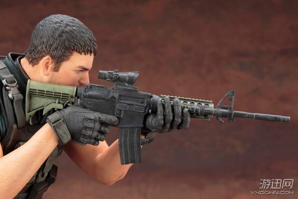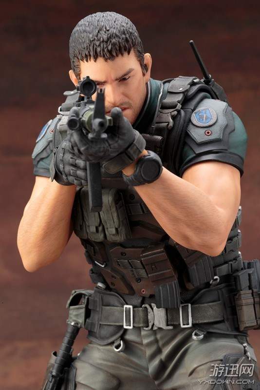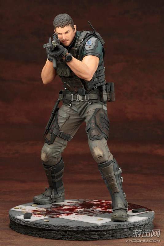 我们可以看到,这两款手办的整体造型均为双手持枪作瞄准射击状态,两人脚下都有一滩血迹。仔细观察手办的细节,我们会发现,除了衣着特点还原到位之外,我们甚至能看清克里斯手臂上的汗毛,可以说是十分考究细节了。