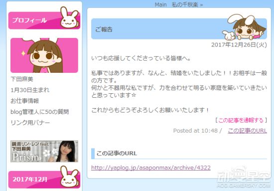12月26日夜晚,曾在《偶像大师》、《妄想学生会》等多部作品担任主要角色配音的声优下田麻美在个人博客发布结婚喜讯,对方的身份为“一般男性”。
