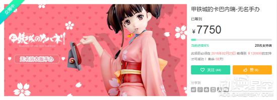 《甲铁城的卡巴内瑞》女主角无名因其可爱而潇洒的形象深入人心,近日一款无名身穿浴衣的手办在京东开启众筹活动,目标数额为12万元人民币。