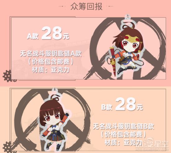 此外,按照捐款档次,募资28元的支持者可以获赠无名战斗服钥匙链(两款二选一),48元可以获得全两款钥匙链,而捐款498元的顾客则能够免运费得到本款浴衣版手办和价值300元的手游大礼包,以上赠品将在众筹成功后三至五个月之内发送。