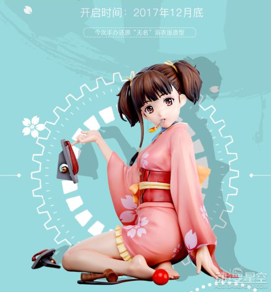 本款无名浴衣手办由《甲铁城的卡巴内瑞》手游运营方盖娅互娱,以及中国原创手办生产商末那工作室合作打造,众筹活动已于12月底开启。其中萝莉无名身穿可爱浴衣,指尖勾起木屐的姿态格外令人垂涎。细节方面,制作者在浴衣的花饰、剑玉的做工、口中的吹笛和大腿皮肤的光洁程度等方面大费文章,尽可能呈现出无名的可爱之处。