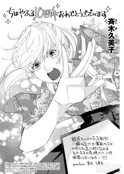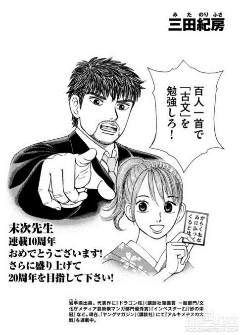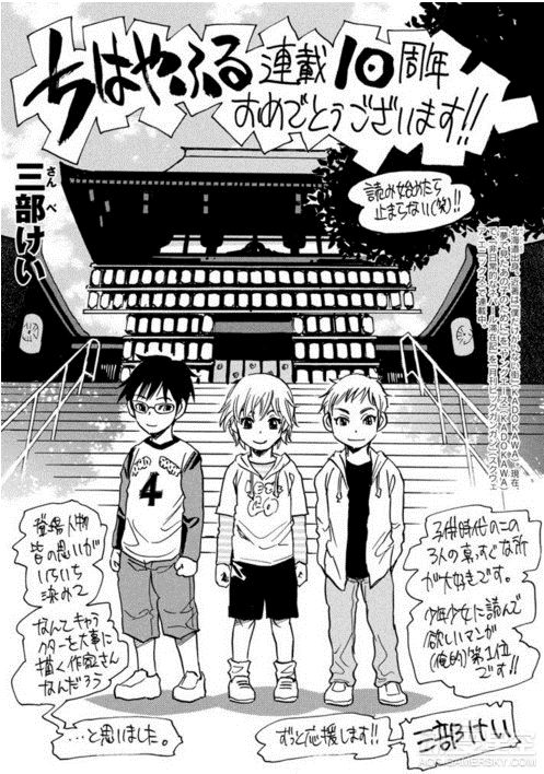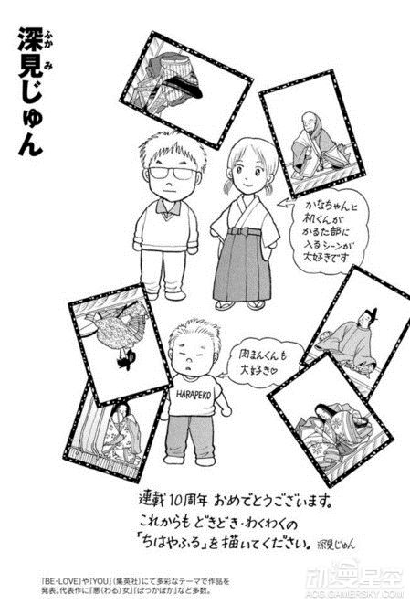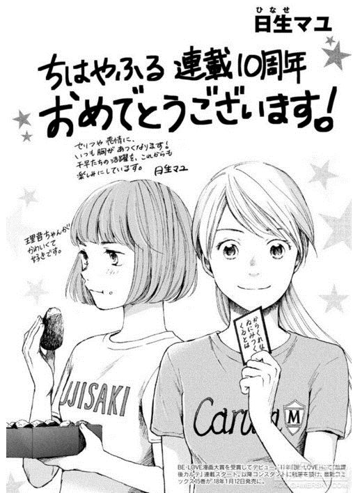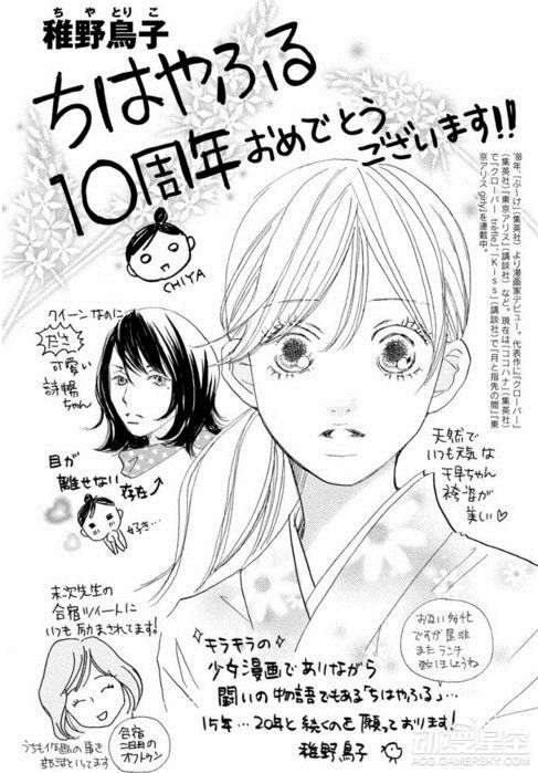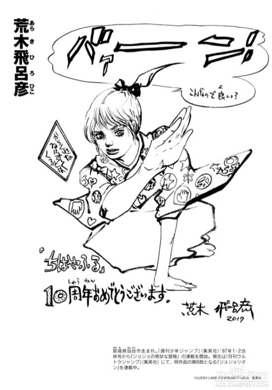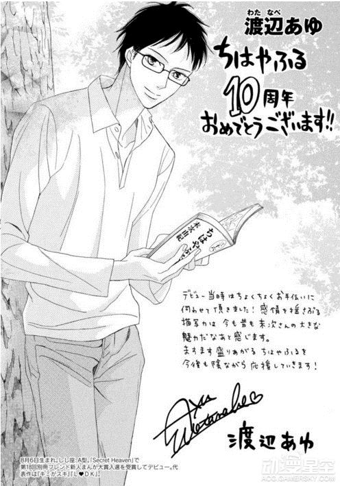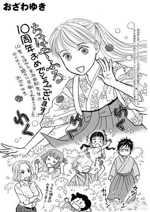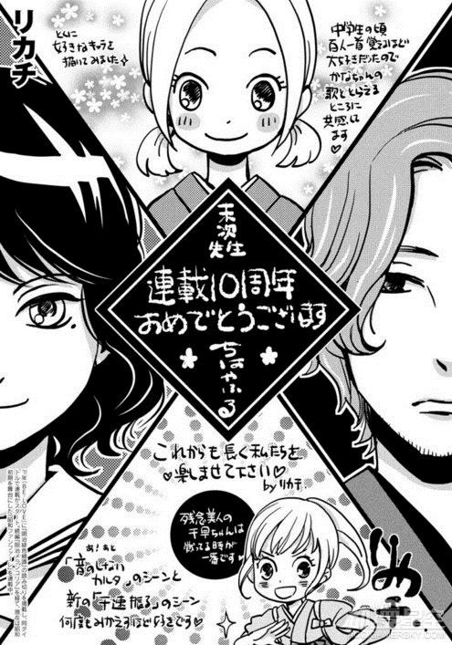 为了庆祝末次由纪笔下的《花牌情缘》连载10周年,包括青山刚昌、真岛浩和高桥留美子在内的数十位漫画家绘制了精美贺图以示庆祝,不过荒木老师你的画风……