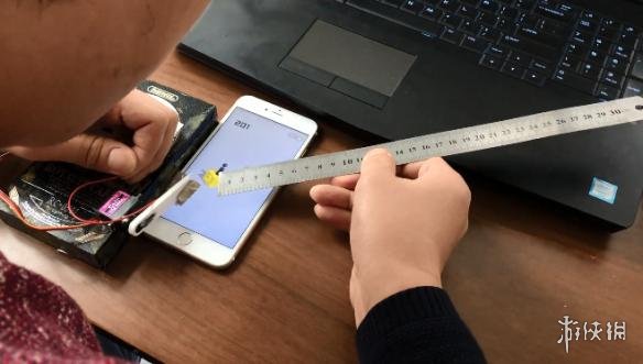 视频显示,一个小型机械手臂悬挂在手机屏幕上方,然后用尺子量出两个箱子间的距离,输入电脑,机械手臂就会根据距离自动调整按压屏幕的时间,精准无比。