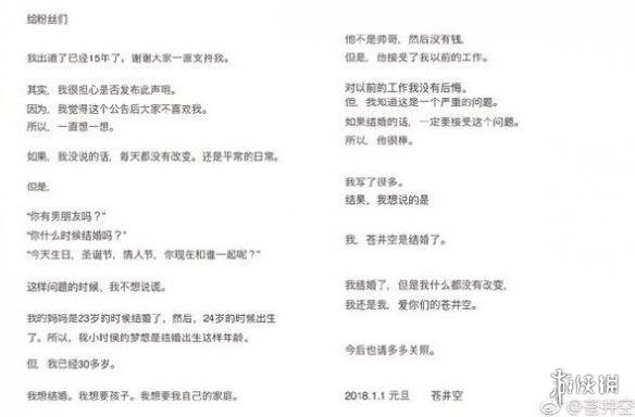 1月1日,34岁的苍井空在网上晒出无名指戴钻戒的照片,并公布结婚喜讯。她透露老公不是帅哥,也没有钱,但接受了她以前的工作。她表示“对自己以前的工作没有后悔”,并称“我结婚了,但我什么都没有改变”,“我还是我,爱你们的苍井空”。