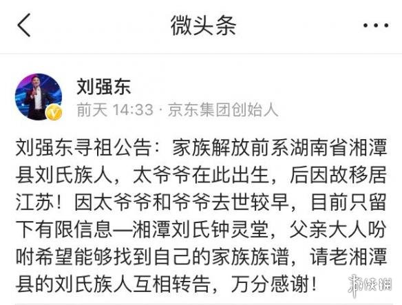 刘强东在公告中说:家族解放前系湖南省湘潭县刘氏族人,太爷爷在此出生,后因故移居江苏!因太爷爷和爷爷去世较早,目前只留下有限信息—湘潭刘氏钟灵堂,父亲大人吩咐希望能够找到自己的家族族谱,请老湘潭县的刘氏族人互相转告,万分感谢!