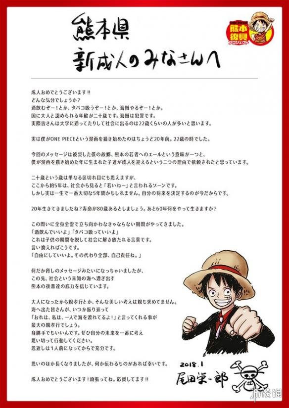 在写给年轻人的贺词中,尾田荣一郎表示:“恭喜大家成人了,不知道大家有什么样的心情。是想喝酒,吸烟,还是当海贼呢?国家法定成人年龄是20岁,当海贼是犯罪。实际上很多人在上完大学,走出社会是在22岁左右。我也是在20年前开始画《航海王》的,也就是22岁的时候。这次我要为自己的受灾故乡写贺词出于两个理由,第一是为熊本的年轻人打气,其次是在我开始画《航海王》这年出生的孩子已经成人了。20岁是人生的一道分水岭,今后5年,在社会看来还很年轻,但实际上这可能是人生最重要的5年,现在就决定了自己的将来。大家已经活了20年了,如果按照80岁寿命计算,今后60年要做什么呢?为了回答这个问题必须倾尽全力。可以喝酒吸烟了,这是摆脱儿童阶段,在社会解放的话。换言之就是自由了,但与此同时也意味着要自己负全部责任。这话听起来吓人,但我相信熊本的后辈们的潜力,你们会向社会这个未知的海洋前进。父母并不希冀你们成人后就能尽到孝道。出海的各位总有一天会回顾过去并说:‘我是独立一人渡过大海的!’这就是最大的孝道了。任性无所谓,关键是要在最能考虑自己将来的情况下采取行动,当你能够独当一面就是最大的报恩了。”