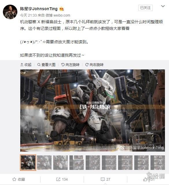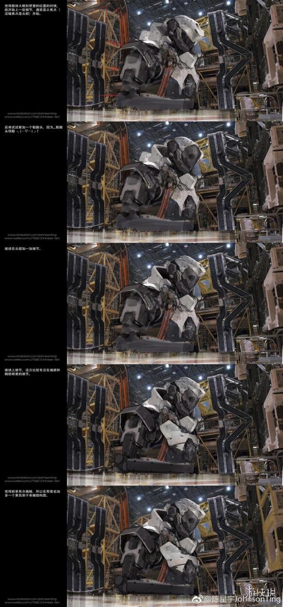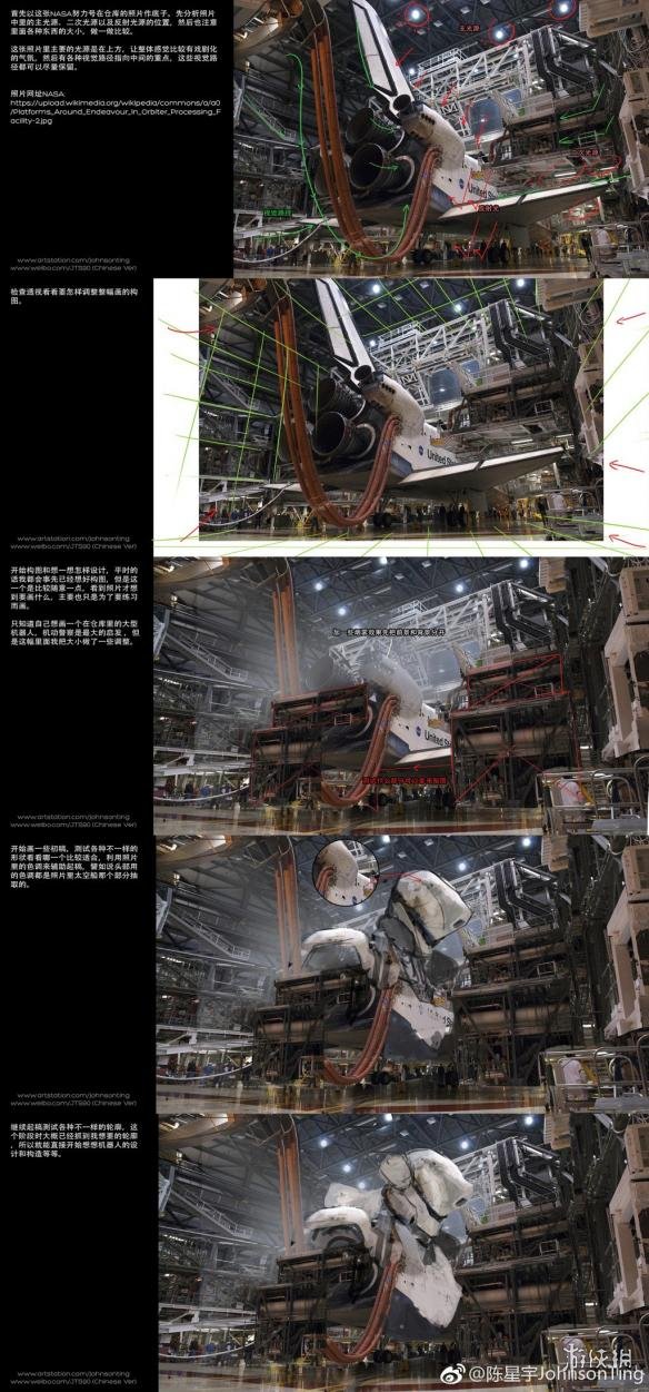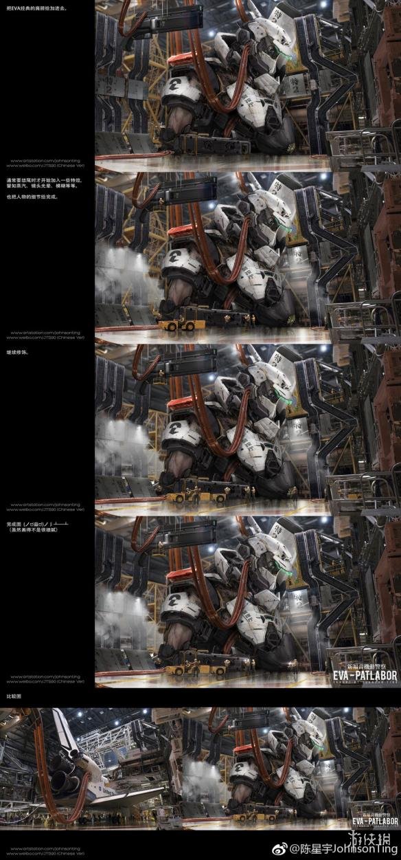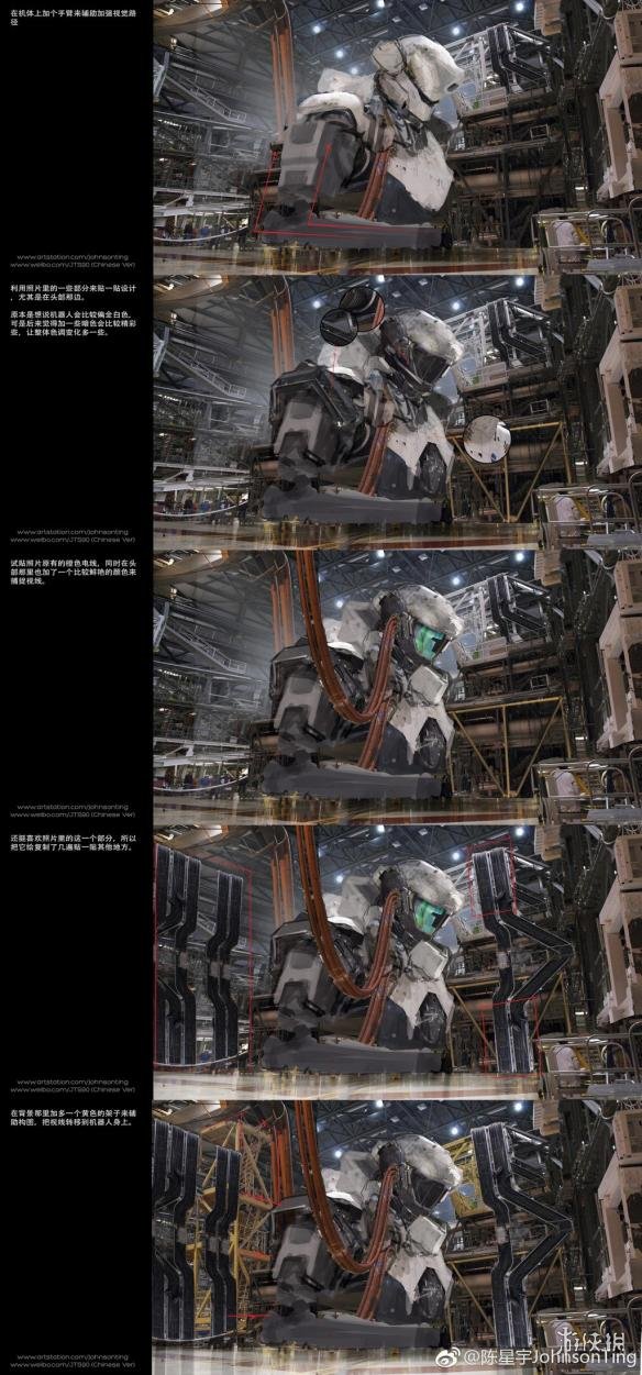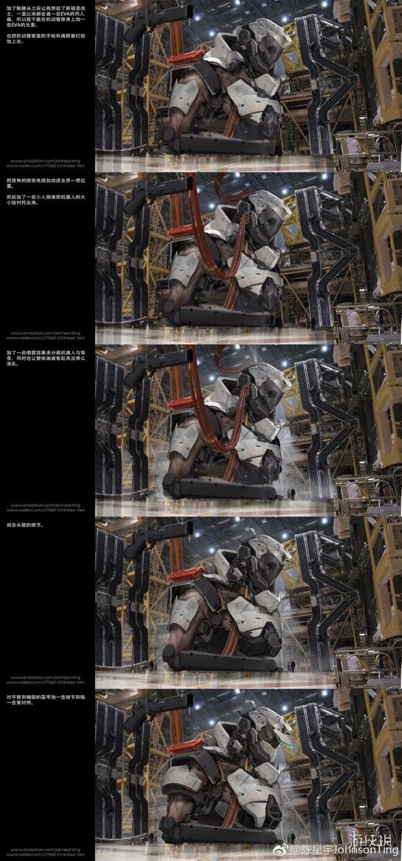 原本一张NASA努力号太空飞船在仓库中的照片,经过一步步细致的处理,融入了种种奇思妙想,最终变成了炫酷的“新福音机动警察”机甲,不得不让人叹服大触妙笔生花。
