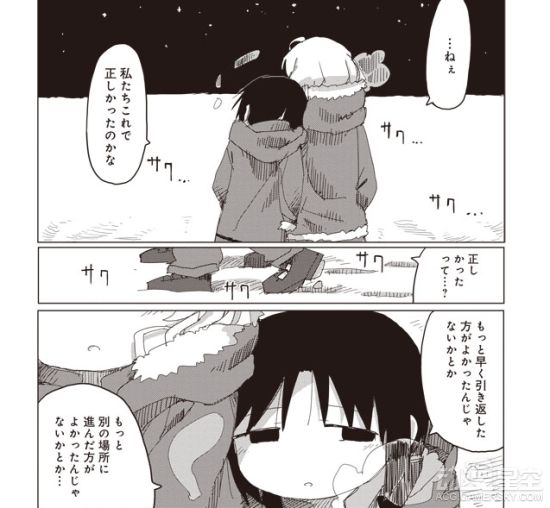 当顺着曲折的楼梯来到最顶层之后,小千与尤莉发现这里并不是她们想象的那样充满希望,仅仅是一片白茫茫的雪原而已。倚靠石墙坐下休息时,尤莉准备用食物庆祝登顶,却被小千告知“已经没有了”,于是只好用水壶干杯代替。