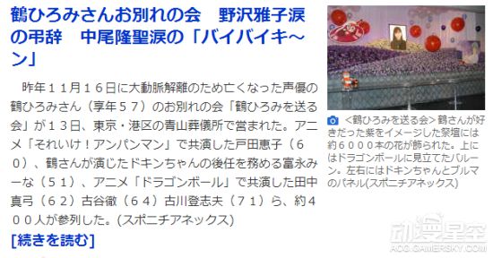 2017年11月16日,曾为《龙珠》布玛、《面包超人》毒菌妹妹等多位经典角色配音的声优鹤弘美女士在驾车时因大动脉剥离而不幸离世,享年57岁。在生前同事野泽雅子等人的发起下,鹤弘美的告别会于1月13日在东京港区青山殡仪馆举行,田中真弓、古谷彻、古川登志夫、中尾隆圣和户田惠子等多位声优老前辈出席。