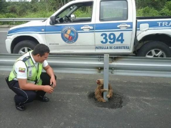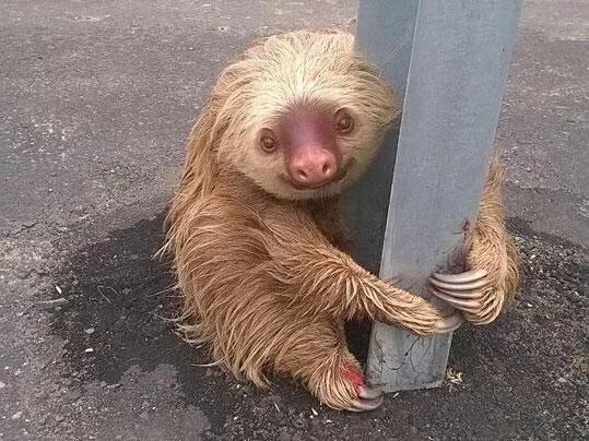 现实生活中的树懒也蠢萌得不行,一只来自厄瓜多尔的树懒不知怎么就跑到了高速公路上,还抱着铁杆子就不撒手了,一脸无辜耍无赖。赶来营救的交警跟它聊了好一阵,才把它安全送回家。毕竟这只树懒全速前进也只能达到每秒6厘米。