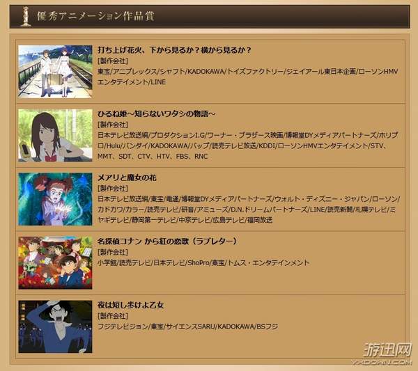 根据“日本アカデミー賞”官方网站公布的结果,本次入围的五部动画均被称为“优秀作品”,其中包括了新房昭之导演的《烟花》、神山健治导演的《午睡公主~我不为人知的故事~》、米林宏昌导演的《玛丽与魔女之花》、静野孔文导演的《名侦探柯南:深红的恋歌》和汤浅政明导演的《春宵苦短,少女前进吧!》。