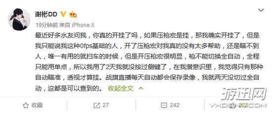 DD通过微博(@谢彬DD)发文承认了自己开鼠标宏的事实,内容如下: