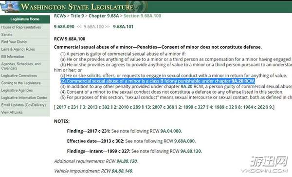 华盛顿法务部网站显示,使用金钱诱惑并和未成年人发生关系属B级重罪
