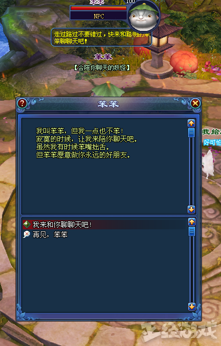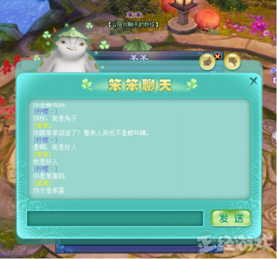 暖男笨笨虽然不是天赋异禀的闪亮“妖”星。但他通过好好学习,学会了人类的语言,贡献一则小弟我和笨笨的对话,目前他除了会怼玩家和夸自己之外还说不出别的话,再这样下去他和人类相处的日子会更加艰难。笨笨就在青丘边上,有时间的玩家可以去调教调教他。只要人人都献出一点爱,世界将变成美好的人间。