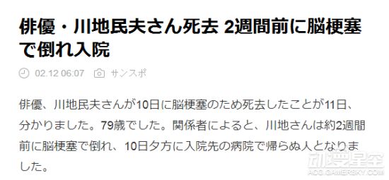 根据日本媒体报道,曾在《迪迦奥特曼》里饰演TPC总监泽井聪一郎的演员川地民夫已于2月10日因脑梗塞病逝,享年79岁,川地先生的葬礼将在本月16日举行。