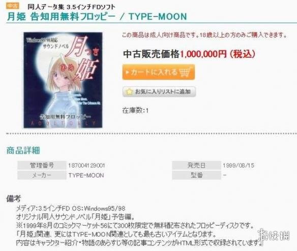 而在最近,日本主营二手商品的综合性网站“骏河屋”将这张《月姬》资料软盘放到货架上,标价竟高达100万日元!虽然这个价格并不算高得太离谱,但似乎也不是一般普通人能够轻易出手的价位。再加上现在大部分电脑已经没有了软盘驱动器,因此买回家之后似乎除了“供起来”再无其他使用方法。