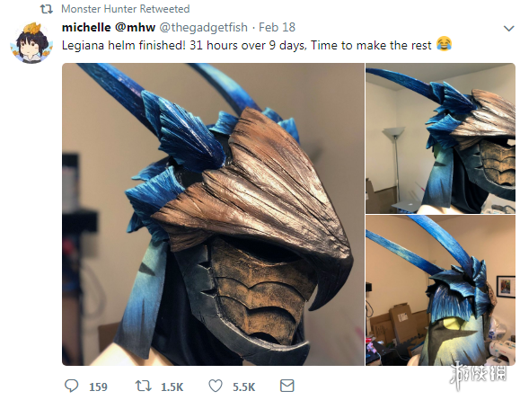《怪物猎人世界(Monster Hunter World)》官方推特日前分享了一名玩家大神手工制作的风飘龙头盔,做工非常精良,玩家michelle表示这款风飘龙头盔花了他31个小时,历时9天多完成。从图片来看,头盔的蓝色龙角和面部涂装堪称神级还原。相信戴上去一定很帅,不知道这名大神玩家是否会打造风飘龙全部套装。