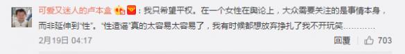 在微博中,UU妹谈到“任何一个女人不论如何都不该因为有比较丰富的性经验或者恋爱史就被称为“公交车”,就连被称为“公交车”的我今年虚岁25了,两段恋爱经历,(据我所知两次真的不算多吧)都是三年以上,现在这段已经进入第六个年头了。我不是所谓传统保守,我是思想开放,什么样的观念我都能接受理解,但是不代表我自己会那样去做。”。而文中提到的另一件事就非常尴尬了。UU妹讲述和朋友组队吃鸡,“游戏过程中我们在找车,她突然一个不注意说这里有一辆uu车。这个梗是最近才有的,绝地里有一辆巴士,侮辱我的人便称巴士为“uu车”。”