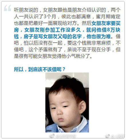自己认识了3个月女友要买房,问自己借8万,房子写女朋友父母的名字,借还是不借?借吧,怕以后没在一起,要钱非常麻烦;不借吧,怕女友觉得他小气就分了。一时间,小伙有一点抓瞎。