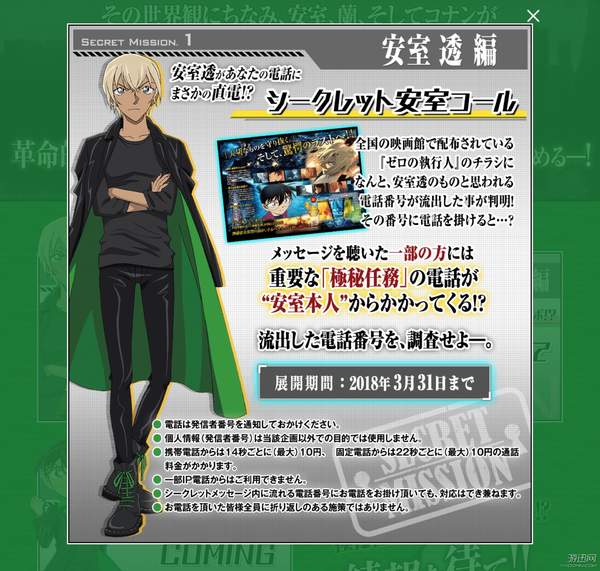 事实上,这只是配合《零之执行人》剧场版宣传的一项活动而已,从3月3日开始,日本全国电影院中的《柯南》电影宣传单上将会刊登安室的电话号码,只要打过去就可以听到安室透声优古谷彻的留言,甚至还有机会可以接到安室打来的机密电话。