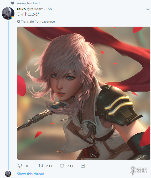 日前,新加坡大神画师raiko在推特上分享了一张《最终幻想13(Final Fantasy XIII)》雷霆姐的CG插画,从图片来看,画风很柔和趋向写实,把雷霆姐表现的太美了,逆光效果也很赞,动态感表现非常到位。这张《最终幻想13》雷霆姐的插画也获得加拿大女画师Sakimichan的青睐。