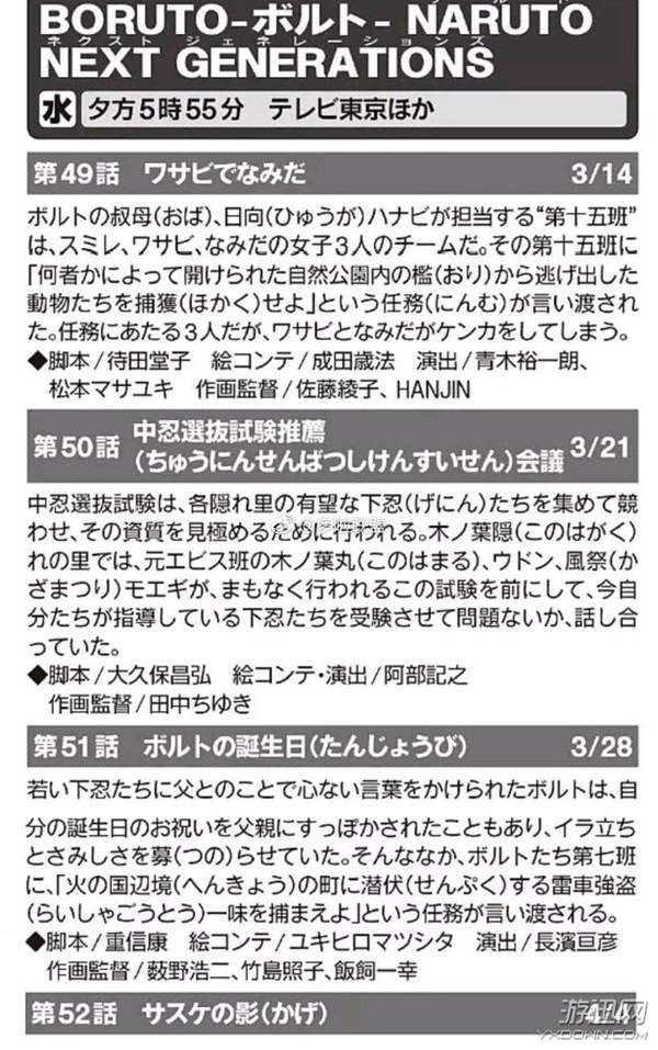 3/28 51话《博人的生日》:年轻的下忍们无心的话语提到了博人和父亲的父亲,而且自己的生日也被父亲完全放鸽子。闹心和寂寞的情绪不断膨胀的博人。在这样的情况下,还突然下达任务说要博人所在的第七班去抓捕潜伏在国境的雷车强盗。