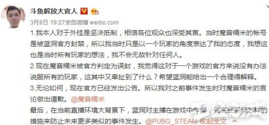 昨天,绝地求生最大的冤案被翻盘了,曾经被蓝洞证实使用外挂的主播“魔音糯米”,斗鱼直播平台也发出公告,称其直播间永久封禁,现在蓝洞官方证实其未开挂。斗鱼方面也将其直播间悄悄解封,他的直播间也已经重新开启。不过,截止正经小弟发稿前,斗鱼方面现在还尚未给出任何声明。
