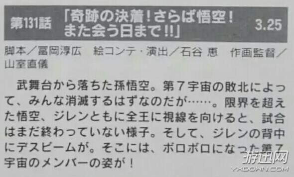 将于3月25日开播的131话《奇迹的决胜!再见悟空!直到再会的那一天!!》宣告了本篇的结束。最终话剧情中,悟空从擂台上掉落下来。正当第7宇宙的成员们以为败局已定,大家要被消灭时,全王却并没有结束比赛的样子。就在此时,吉连的后背中了一记死亡光线,伴随着众人目光的移动,第7宇宙那位伤痕累累的战士出现了!