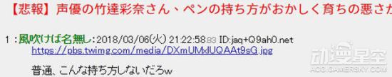 在本周的广播节目结束后,竹达彩奈在录音室绘画的照片被贴出,却被某位网友发帖称“从握笔姿势可以看出家教很差,一般人哪会这样握啊”,还加上了“悲报”的前缀。讨论一出,众多网友纷纷参与其中,有人同意发帖人的观点,也有人觉得没什么奇怪的,认为绘图时候就是这样的姿势。