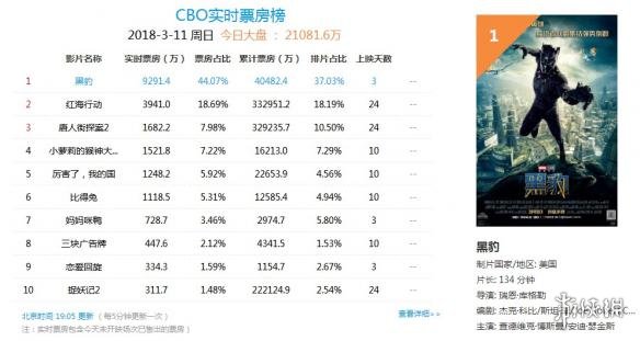 根据CBO实时票房榜数据,《黑豹》目前实时票房为9291.4万,排片占比也达到了37.03%,才上映3天就有这样的成绩,着实让人期待《黑豹》接下来在国内市场的表现,你觉得这部电影的累计票房会达到多少呢?