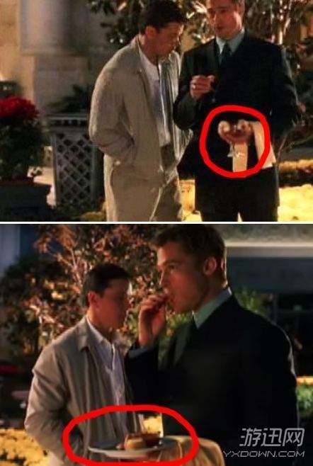 《十一罗汉》里,一个take过后,布莱德彼特手上的酒就变成盘子了~