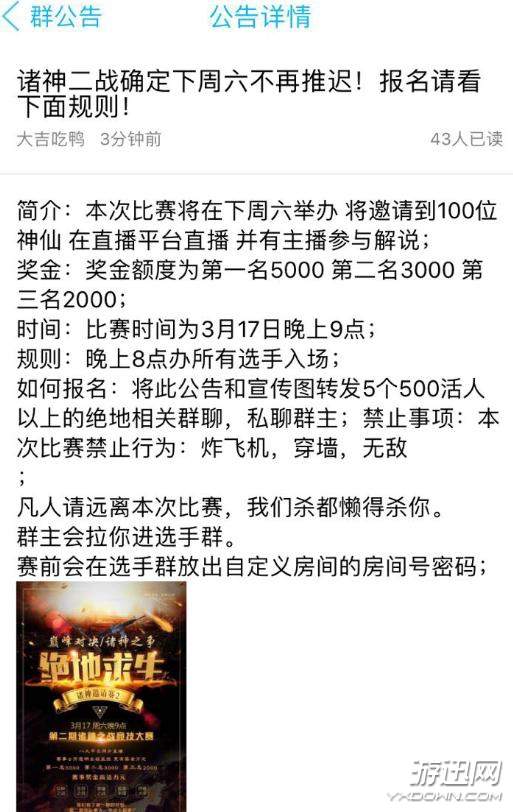 在公告中公布了比赛规则:禁止炸飞机、穿墙、瞬移、无敌等,能用的大约为透视、自瞄、子弹追踪及秒打药…另外还的警告凡人远离本次比赛,因为别人连杀都懒的杀你!