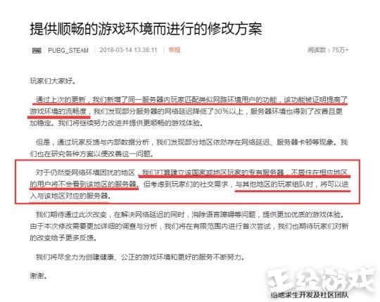 公告表示:蓝洞将打算建立该国家或地区玩家的专有服务器,不居住在相应地区的用户将不会看到该地区的服务器。但考虑到玩家们的社交需求,与其他地区的玩家组队时,将可以进入与该地区对应的服务器。
