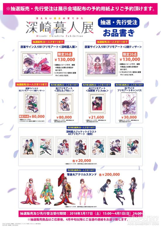 从3月17日至4月1日,《路人女主的养成方法》与画师深崎暮人在秋叶原举办作品展,现场除了有众多精彩的福利美图外,几只等身角色塑料板的高价也引发了关注。