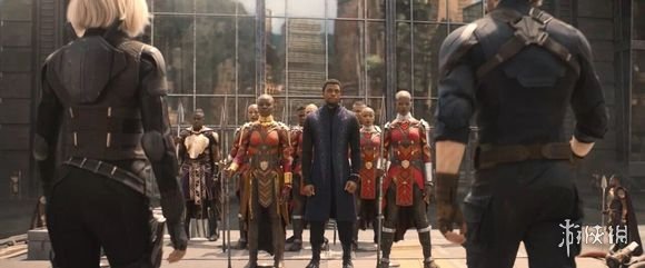 迎接复仇者众人的是中间的黑豹陛下和他两侧的亲信——奥克耶和阿由。其中图片右侧的女亲卫阿由就是《美队3》里怼寡姐的那个帅姐姐,不知道两人在《复联3》中会不会切磋一下。