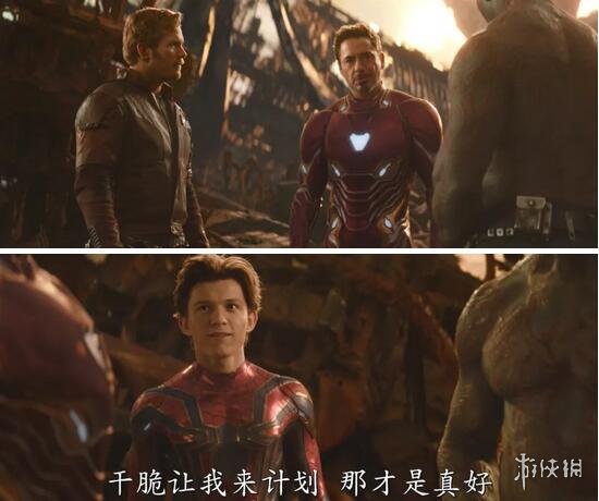 钢铁侠急忙赶来小蜘蛛送钢铁蜘蛛战甲,于是就有了这样的一幕。