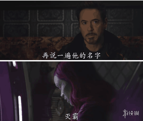 紧接着是钢铁侠和卡魔拉的一段对话,钢铁侠问:他的名字是?卡魔拉答道:灭霸!